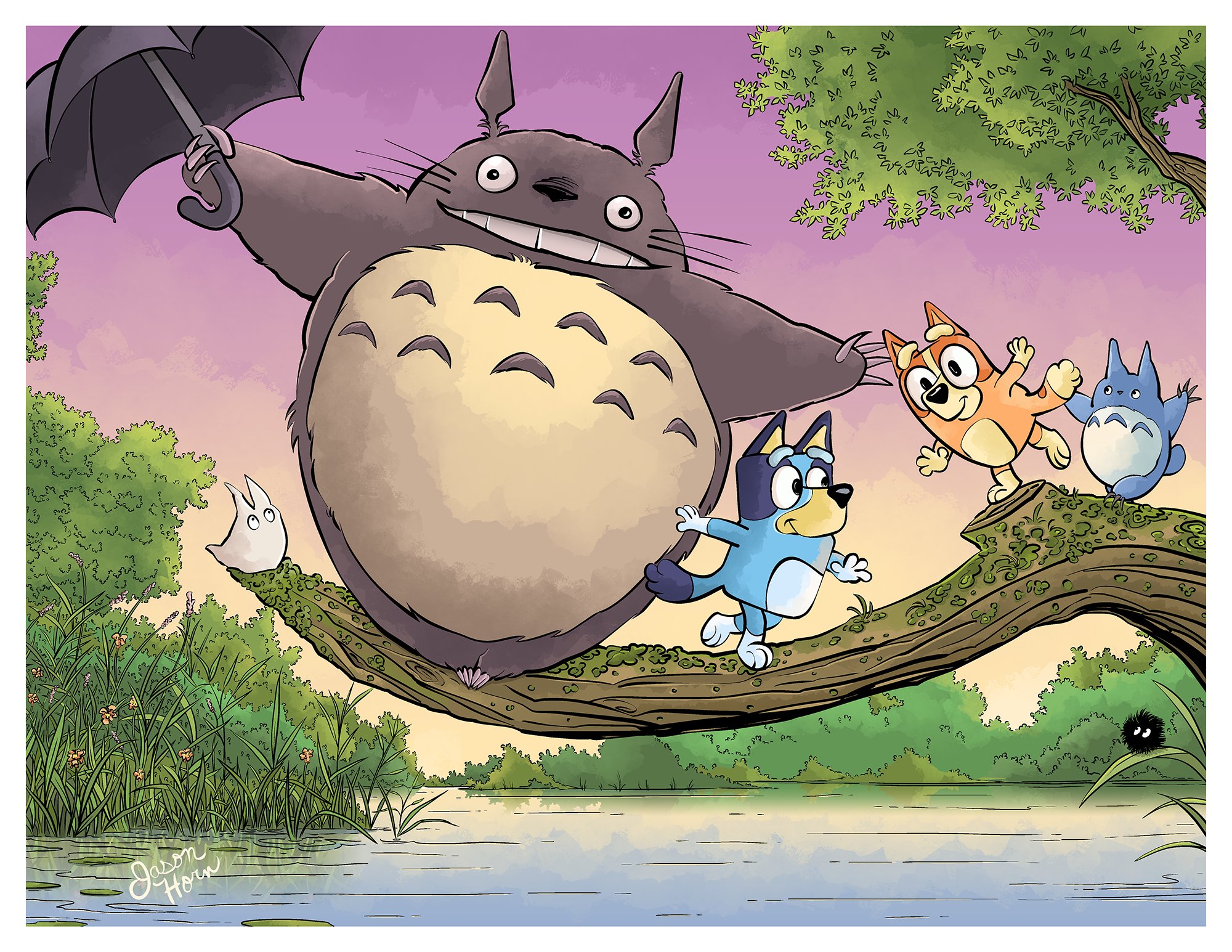 8.5 x 11 card stock print by Jason Horn of a Bluey and Totoro mashup!