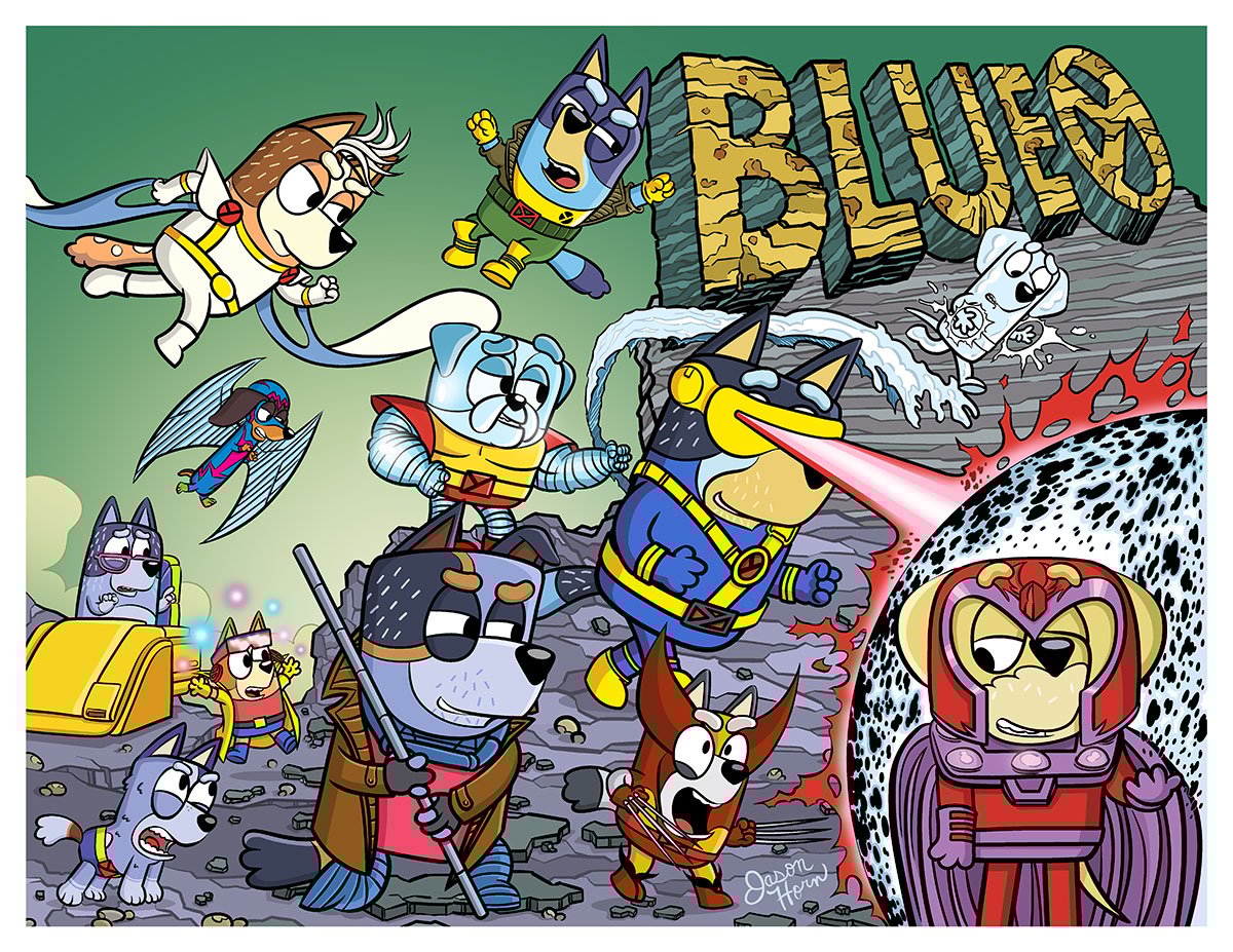 8.5 x 11 card stock print by Jason Horn of a Bluey/X-Men mash up!